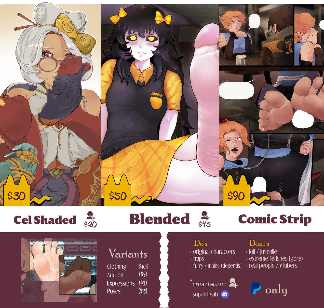 • Complex backgrounds may increase charges• Your commission may be streamed or published at an undisclosed future, unless you specify a private arrangement
